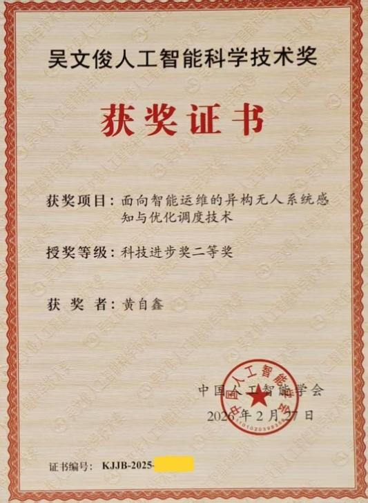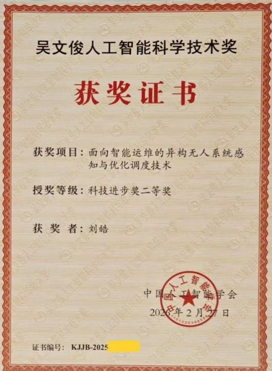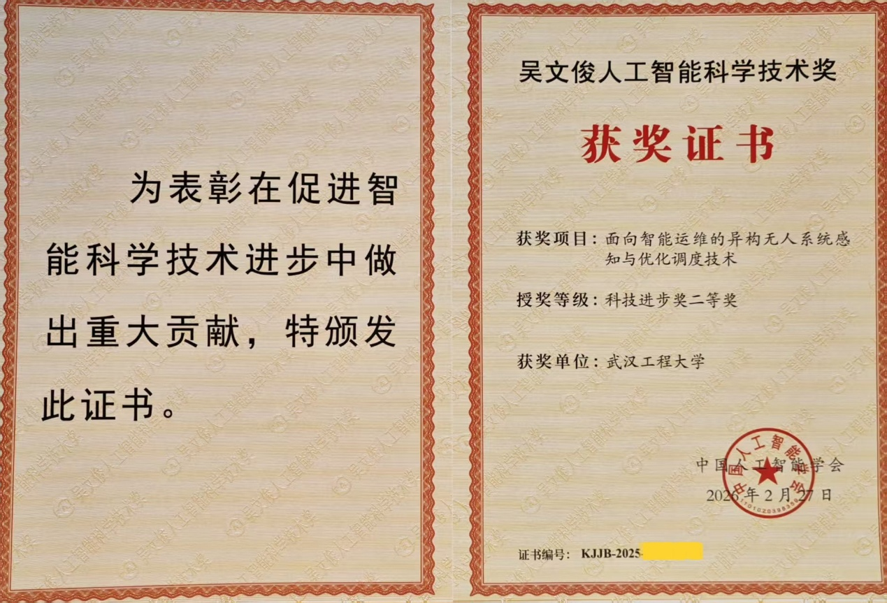 本网讯(通讯员 刘皓 朱丽娜)2026年3月29日,2025吴文俊人工智能创新大会暨第十五届吴文俊人工智能科学技术奖颁奖典礼在江苏常州召开。由武汉工程大学黄自鑫教授联合北京理工大学、国网山西省电力有限公司孝义市供电分公司、浙江浙能数字科技有限公司、浙江和朴实业有限公司、国网山西省电力有限公司吕梁供电分公司等单位共同完成的成果“面向智能运维的异构无人系统感知与优化调度技术”获吴文俊人工智能科学技术奖科技进步二等奖。MK体育官方网站主要完成人:黄自鑫、刘皓。