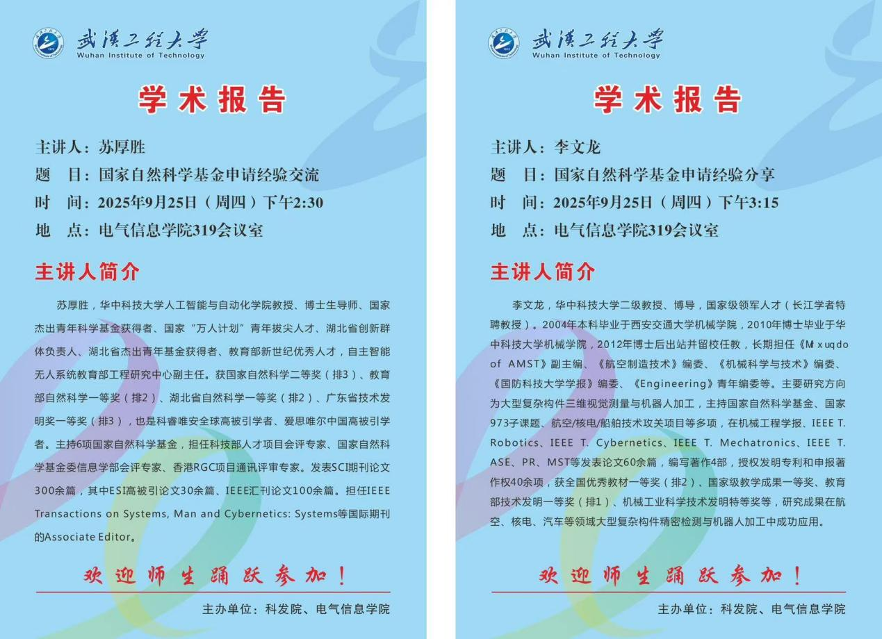 2025年9月25日下午,MK体育官方网站2026年国家自然科学基金申请动员暨经验交流会顺利召开。学校科发院副院长郭琴、MK体育官方网站党政领导班子、55周岁以下具有博士学位教师、拟申请2026年国家自然科学基金的教师等40余人参加会议。会议特邀了华中科技大学人工智能与自动化学院苏厚胜教授、机械科学与工程学院李文龙教授结合自身经验,分别针对信息学部、工材学部的国家自科基金申请进行了经验交流。会议由MK体育官方网站副院长李自成主持。