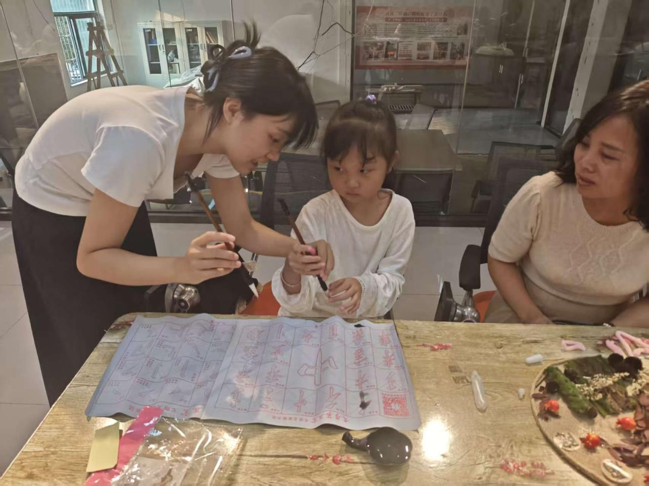 志愿者联合社区党委,积极探索“菜单式”服务模式,根据“一老一小”群体不同需求,开展了三期“墨香润心灵,执笔传雅韵” 毛笔字练习主题活动。志愿者提前将毛笔、宣纸、墨汁等材料整齐摆放至桌面,书法老师手把手示范横、竖、撇、捺、点等基本笔法,还特意纠正居民的坐姿与握笔方法,确保每一位参与者都能掌握基础要领。孩子们模仿着大人的姿势认真书写,字迹虽显稚嫩却满是认真。居民不时互相交流书写心得,分享握笔、运笔的小技巧。