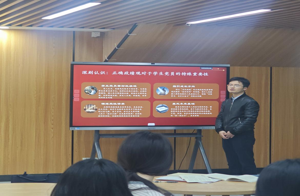 周磊以《树立和践行正确政绩观 做合格的新时代学生党员》为题讲授专题党课。他从全党开展树立和践行正确政绩观学习教育的背景切入,围绕“政绩为谁而树、树什么样的政绩、靠什么树政绩”这三个根本性问题,深入剖析了学生党员树立和践行正确政绩观核心是为同学服务、为集体贡献;关键是求真务实、注重实效;标准是经得起检验、利在长远;保障是廉洁自律、坚守底线,并结合学生中存在的弄虚作假行为等反面现象进行了深刻警示。周磊强调,学生党员树立和践行正确政绩观,要在思想淬炼、专业学习、服务同学、严于律己、引领风尚五个方面争当表率,克服急功近利和形式主义,将“政绩”写在同学的口碑中,写在学校事业高质量的发展里,写在成长为担当民族复兴大任时代新人的征程上,以实际行动争做让党放心、让同学满意的合格新时代学生党员。